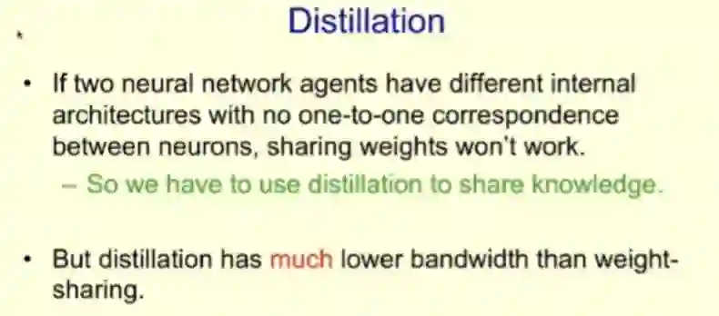 用蒸馏共享知识的效率并不高,带宽很低。就像在学校里,教师都想把自己知道的知识灌进学生脑袋,但这是不可能的,因为我们是生物智能,你的权重对我没用。