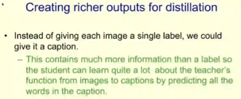 很显然,我们可以创建更丰富的输出以供蒸馏。比如说我们可以为每张图像赋予一个描述,而不仅仅是单个标签,然后再训练学生来预测这些描述中的词。