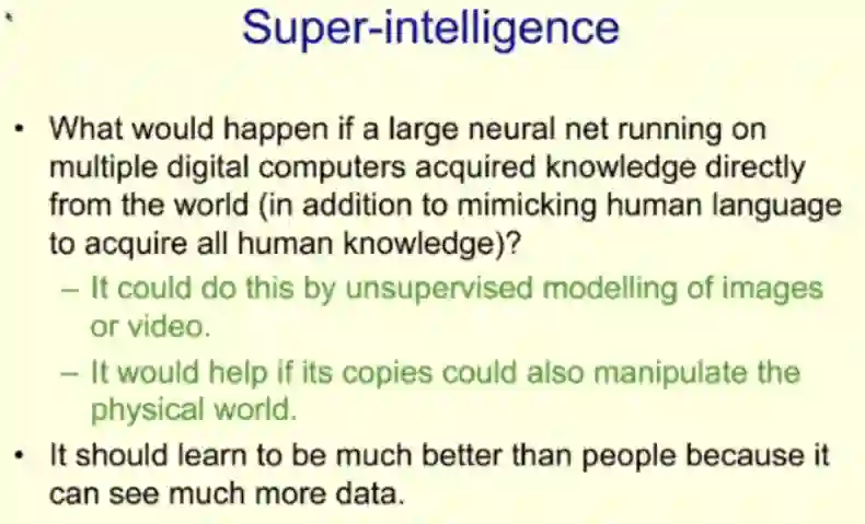演讲一开始,Hinton 便宣称,超级智能(superintelligence)诞生的时间可能会比他曾经想象的早得多。这一观察引出了两大问题:(1)人工神经网络的智能水平将会很快超越真实神经网络吗?(2)人类是否能保证对超级 AI 的控制?在大会演讲中,他详细讨论了第一个问题;针对第二个问题,Hinton 在演讲的最后表示:超级智能可能将很快到来。