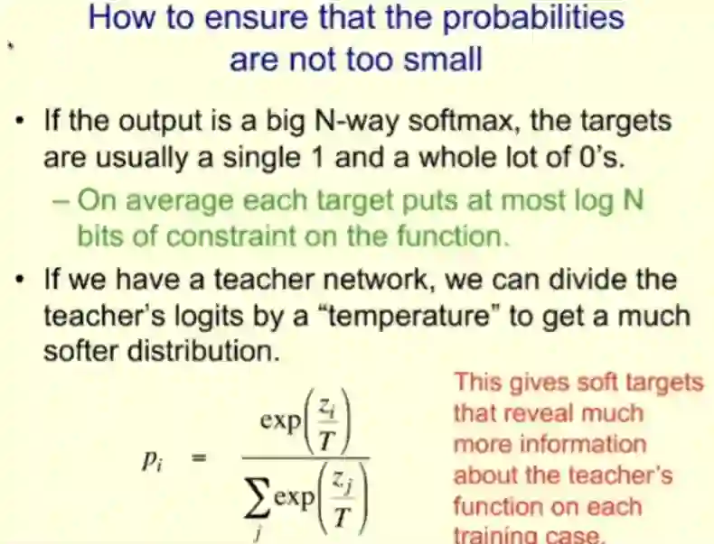 为了确保这些概率不是太小,可以「高温」运行教师,在训练学生时也以「高温」运行学生。比如说,如果采用的是 logit,那就是输入 softmax 的东西。对于教师来说,可以基于温度参数对其进行缩放,进而得到一个更 soft 的分布;然后在训练学生时使用同样的温度。