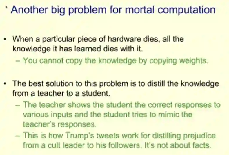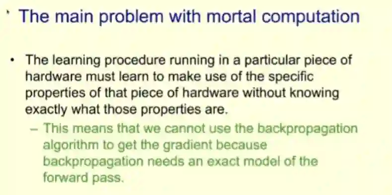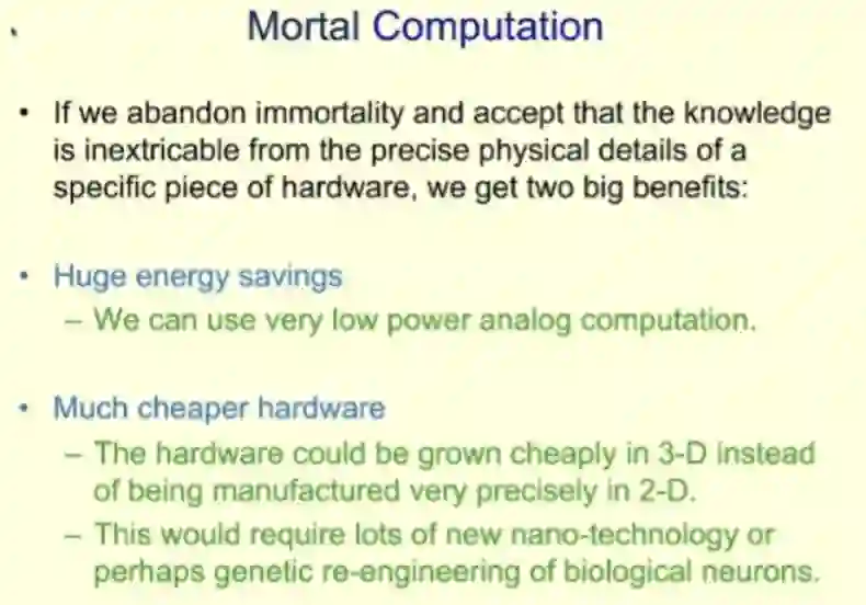 **而对于软硬件协同设计,Hinton 提出了一个新概念:Mortal Computation。**对应于前面提到不朽形式的软件,我们这里将其译为「可朽计算」。