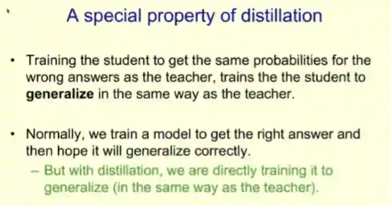 蒸馏有一个很特殊的性质,那就是当使用教师给出的概率来训练学生时,那就在训练学生以老师那样的方式来进行泛化。如果教师为错误答案分配了一定的小概率,那么也会训练学生泛化到错误答案。
