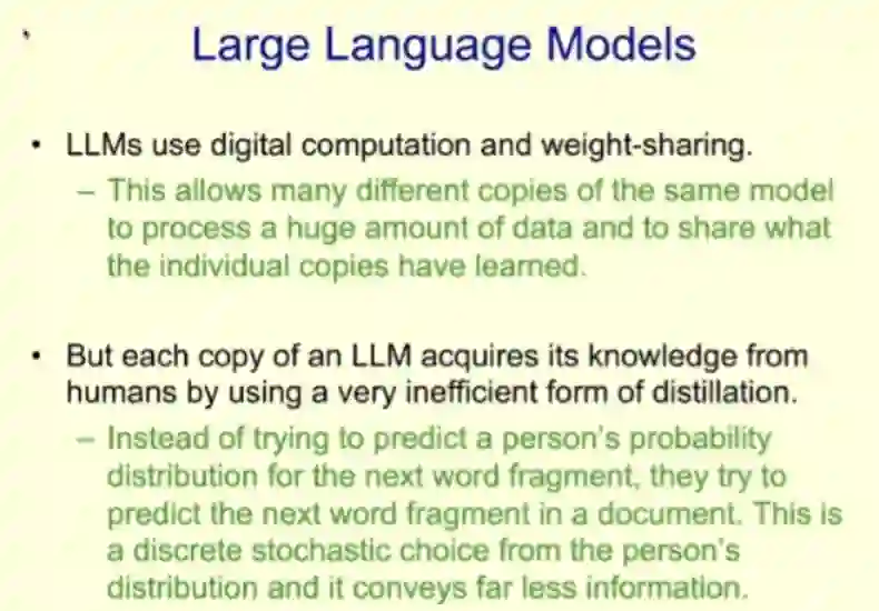 实际上,LLM 在学习文档时就已经在学习人类数千年所积累的知识了。因为人类会通过语言描述我们对世界的认识,那么数字智能就能直接通过文本学习来获得人类积累的知识。尽管蒸馏的速度很慢,但它们也确实学到了非常抽象的知识。