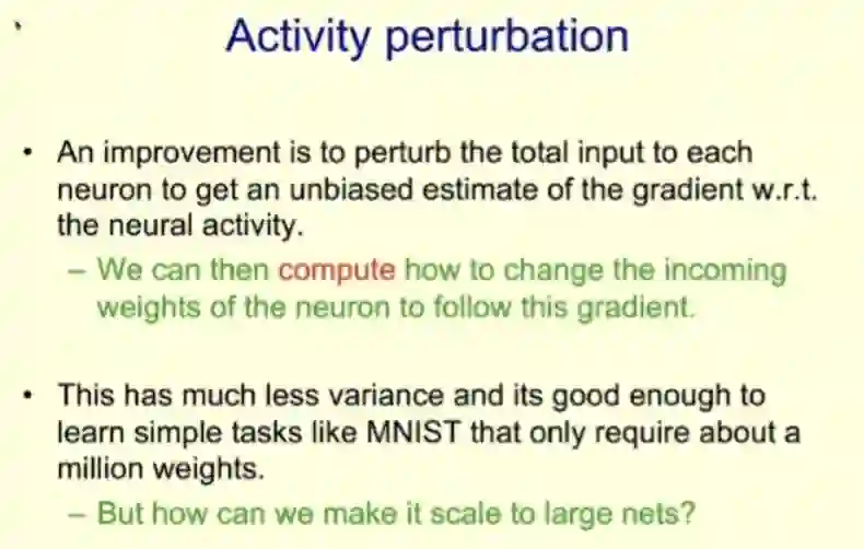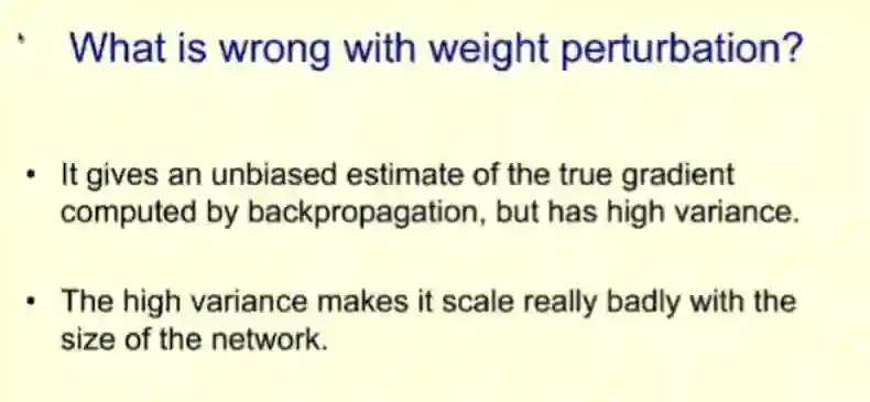 这个算法的优点是其大致上的行为模式与反向传播一致,同样遵循梯度。但问题是它具有非常高的方差。因此,当网络规模增大时,在权重空间中选择随机移动方向时所产生的噪声会很大,让这个方法难以为继。这就意味着这种方法仅适用于小型网络,不适用于大型网络。