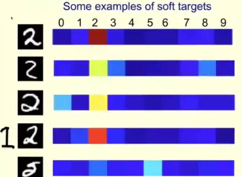 对于第一行,教师确信它是 2;教师对第二行也有信心是 2,但它也认为可能是 3 或 8。第三行则有些像 0。对于这个样本,教师应该说这是一个 2,但也应该留点可能性给 0。这样一来,比起直接告诉学生这是 2,学生能从中学到更多。