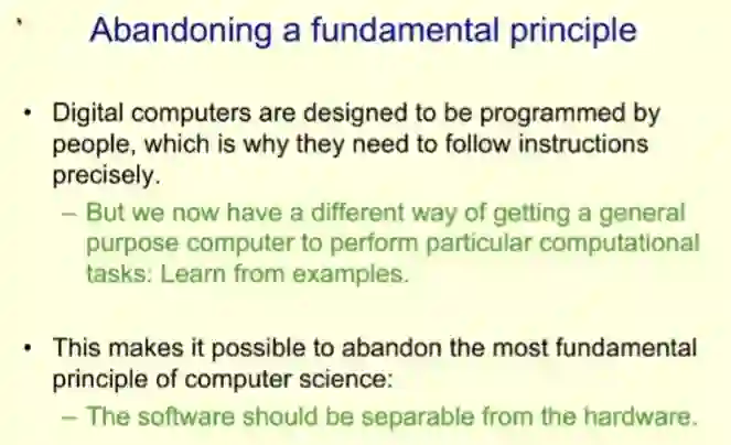 传统计算机之所以采用那样的设计模式,是因为传统计算运行的程序都是人类编写的。现在随着机器学习技术的发展,计算机有了另一种获取程序和任务目标的方法:基于样本的学习。