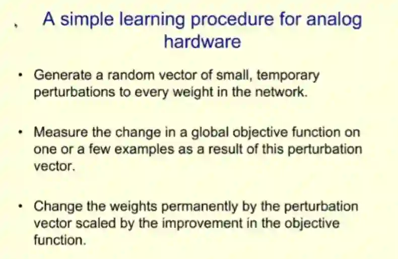 那么既然可朽计算不能使用反向传播,我们又该怎么做呢?下面来看看在模拟硬件上执行的一个简单学习过程,其中用到的方法称为权重扰动。