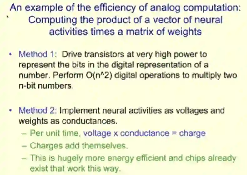而如果使用模拟计算呢?我们可以将神经活动视为电压,将权重视为电导;那么每一单位时间里,电压乘以电导可得到电荷,电荷可以叠加。这种工作方式的能效会高很多,而且其实现在已经存在这样工作的芯片了。但很不幸,Hinton 表示,现在人们还是要使用非常昂贵的转换器将模拟形式的结果转换成数字形式。他希望以后我们能在模拟领域完成整个计算过程。