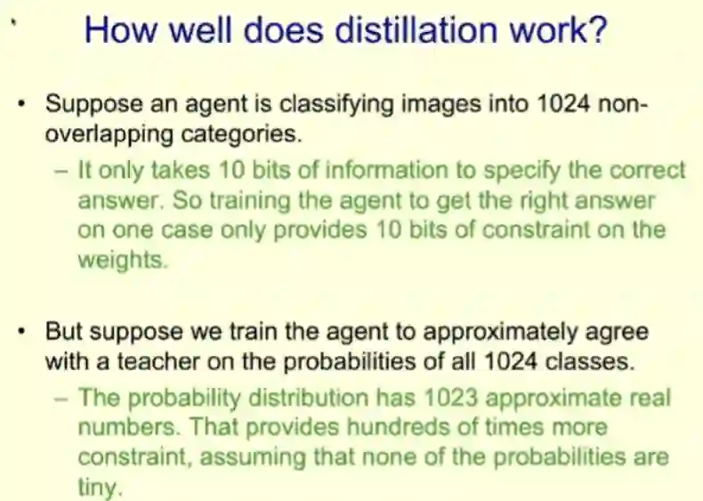 但假如我们训练一个智能体使之与一个教师在这 1024 个类别上的概率大致保持一致呢?也就是说,使该智能体的概率分布与该教师一样。这个概率分布有 1023 个实数,如果这些概率都不是很小,那么其提供的约束就增多了几百倍。