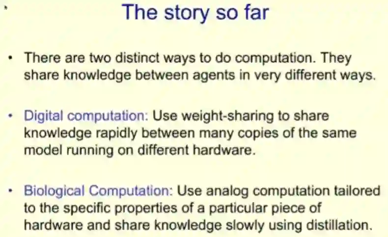 这里先简单总结一下,上面提到了两种截然不同的执行计算的方式(数字计算和生物计算),并且智能体之间共享知识的方式也大相径庭。