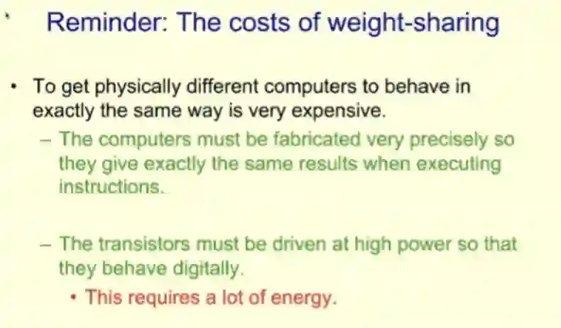 权重共享的成本也很高。要让不同的硬件以同样的方式工作,就需要以极高的精准率生产计算机,使得它们在执行相同的指令时总是会得到相同的结果。另外,晶体管的功耗也不低。