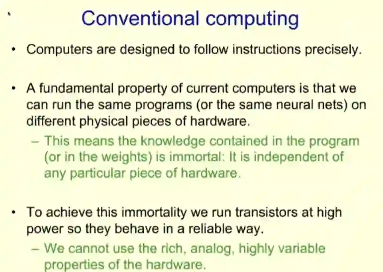 首先,让我们来看看传统的计算方式。计算机的设计原则是要能精准地执行指令,也就是说如果我们在不同的硬件上运行相同的程序(不管是不是神经网络),那么效果应该是一样的。这就意味着程序中包含的知识(如神经网络的权重)是不朽的,与具体的硬件没有关系。