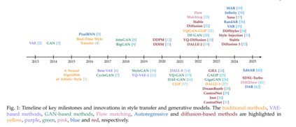 早期的计算机图形启发式方法,随着变分自编码器(VAE)【2】与生成对抗网络(GAN)【3】的提出,逐步演化为深度生成建模技术。Gatys 等人的神经风格迁移开创性地提出使用 Gram 统计量表示视觉风格,催生了实时前馈变体与任意风格迁移方法。 随后,扩散模型【12】以及大规模文本-图像生成系统(如 Stable Diffusion【22】和 DALL·E 2)进一步提升了图像分辨率与语义控制能力。同时,CLIP【43】的引入也使语言引导的风格化成为可能(如 StyleGAN-NADA【44】、CLIPstyler【45】)。 近期的研究则探索结构解耦与高效架构,实现了可实时运行、具备强内容保持能力的 4K 风格迁移系统。图 1 总结了这些重要的技术里程碑。