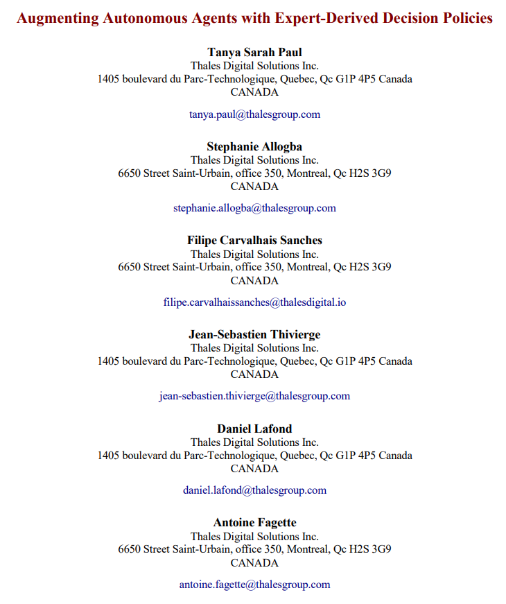 第一步是对四位专家进行访谈。我们采访了来自泰雷兹陆地和航空系统公司的三位航空航天和导航领域专家,以及泰雷兹加拿大防务与安全公司和加拿大皇家骑警反无人机专家。第四位专家是一名战斗机飞行员。这些专家帮助提供了对情景的反馈意见,并帮助验证了专家政策建模的输入。除专家反馈外,我们还借鉴了上述先前的研究成果,以确保概念验证研究基于现实的假设。