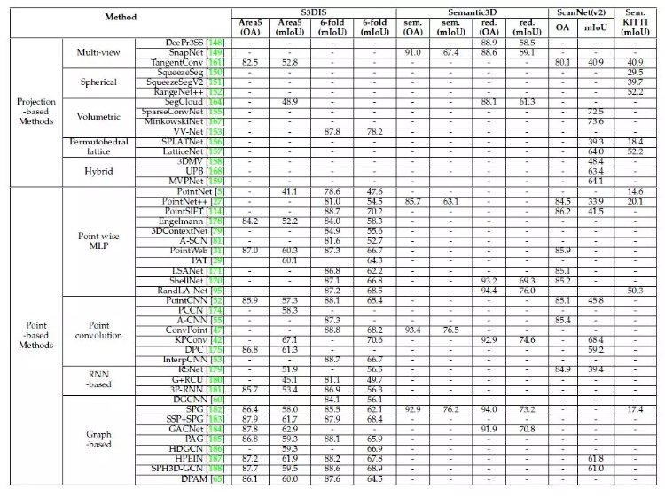 表4:S3DIS(包括Area5和6-fold cross validation)[176]、Semantic3D(包括semantic-8和reduced-8子集)[9]、ScanNet[8]和SemanticKITTI[177]数据集的语义分割结果对比。
