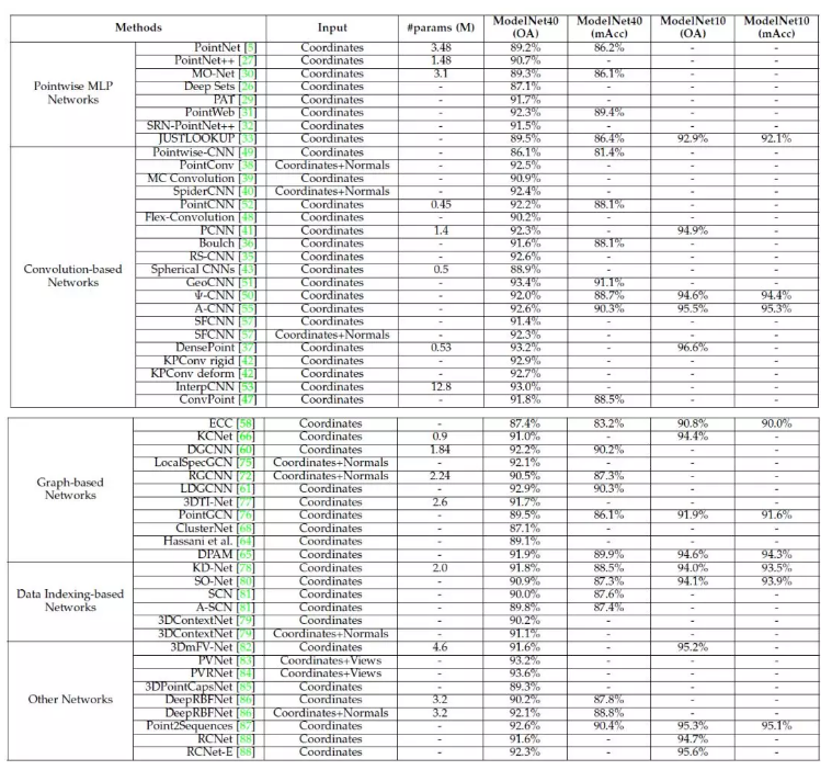 表1:在ModelNet10/40基准上比较三维形状分类结果。这里,我们只关注基于点的网络,“#params”表示相应模型的参数数量。“OA”表示总体精度,“mAcc”表示表中的平均精度。符号“-”表示结果不可用。
