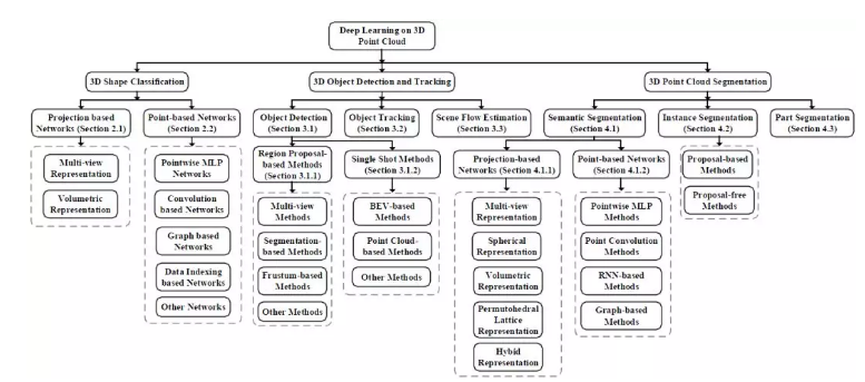这篇论文是第一个专门针对点云的深度学习方法的综述。此外,论文全面涵盖了分类,检测,跟踪和分割等不同应用。图1显示了三维点云的现有深度学习方法的分类。