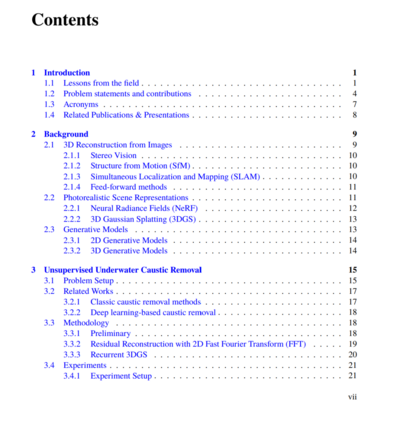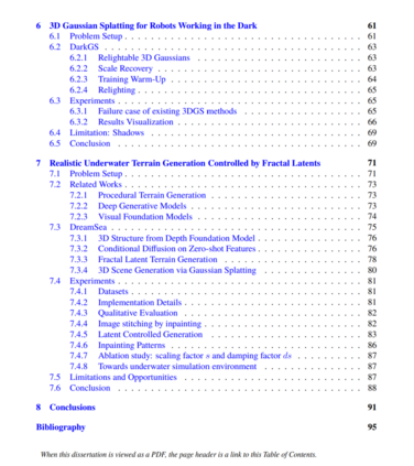 随着现代机器人技术的发展,海底影像对研究人员和公众变得更加易得。本论文利用深度学习和三维视觉技术,从机器人平台采集的海底图像观测中提取有价值的信息。 尽管深度学习和三维视觉算法已在多个领域得到广泛应用,但水下成像面临独特挑战,如缺乏标注、颜色失真和光照不一致等问题,这些因素限制了现成算法的有效性。本论文聚焦于一个核心问题:如何在受到光源和介质干扰严重影响的情况下,从原始水下图像构建三维表征。为实现光真实感的海底三维重建,本文提出并开发了以下算法: (i) 基于循环三维高斯泼溅(recurrent 3D Gaussian Splatting)的无监督水下焦散(caustic)去除方法; (ii) 基于神经反射场(neural reflectance fields)的深水真彩恢复; (iii) 面向机器人平台的相机-光源联合标定方法; (iv) 基于三维高斯泼溅的暗环境重光照方法。 借助机器人收集的大规模海底数据作为训练集,本论文进一步探索了深度生成模型在生成大尺度、具有自然空间变化的水下地形方面的应用。合成的地形可以与所学习的水下光照效应相结合,从而实现逼真的新视角渲染效果。 本文展示了如何将三维计算机视觉与深度生成模型结合物理规律、统计原理以及基础模型,来应对水下机器人感知中的独特挑战。这些研究成果共同奠定了重建高保真水下场景的基础,有助于人类更好地理解海底生态系统,并生成模拟环境,从而缩小水下机器人感知中的“仿真到真实(sim-to-real)”差距。