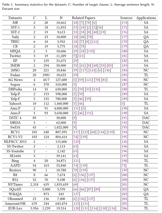 我们在表1中介绍了文本分类的过程和发展,并总结了经典模式在出版年份方面的必要信息,包括地点、应用、引用和代码链接。