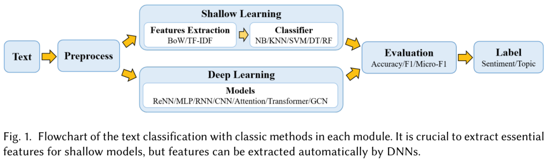 在许多自然语言处理(NLP)应用中,文本分类(为文本指定预定义标签的过程)是一个基本和重要的任务, 如情绪分析[1][2][3],主题标签[4][5][6],问答[7][8][9]和对话行为分类。在信息爆炸的时代,手工对大量文本数据进行处理和分类是一项耗时且具有挑战性的工作。此外,手工文本分类的准确性容易受到人为因素的影响,如疲劳、专业知识等。人们希望使用机器学习方法来自动化文本分类过程,以产生更可靠和较少主观的结果。此外,通过定位所需信息,可以提高信息检索效率,缓解信息超载的问题。 图1给出了在浅层和深层分析的基础上,文本分类所涉及的步骤流程图。文本数据不同于数字、图像或信号数据。它需要NLP技术来仔细处理。第一个重要的步骤是对模型的文本数据进行预处理。浅层学习模型通常需要通过人工方法获得良好的样本特征,然后用经典的机器学习算法对其进行分类。因此,特征提取在很大程度上制约了该方法的有效性。然而,与浅层模型不同,深度学习通过学习一组直接将特征映射到输出的非线性转换,将特征工程集成到模型拟合过程中。