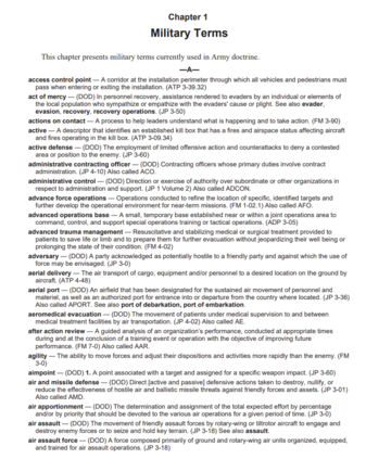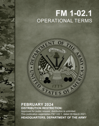 FM 1-02.1 第三版汇编了美国陆军条令出版物(包括 ADP、FM 和 ATP)中批准使用的所有陆军术语和定义。它还包括陆军条令出版物词汇表中使用和列出的联合和北大西洋公约组织(NATO)术语。FM 1 02.1 还列出了批准在陆军条令出版物中使用的简称(无论是缩写还是简称)。