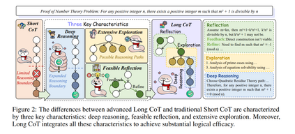 长链推理与短链推理的讨论本节形式化地阐述了长链推理(Long CoT)与短链推理(Short CoT)之间的关键区别,重点在于推理深度、连接的重访以及逻辑节点的探索 [607]。这些区别与系统1(System 1)和系统2(System 2)思维模式明显不同。长链推理与短链推理的比较是在系统2的框架内进行的,其中长链推理涉及更彻底的推理、反思和探索,而短链推理通常优先考虑浅层且高效的逻辑,而非穷尽式的推理。