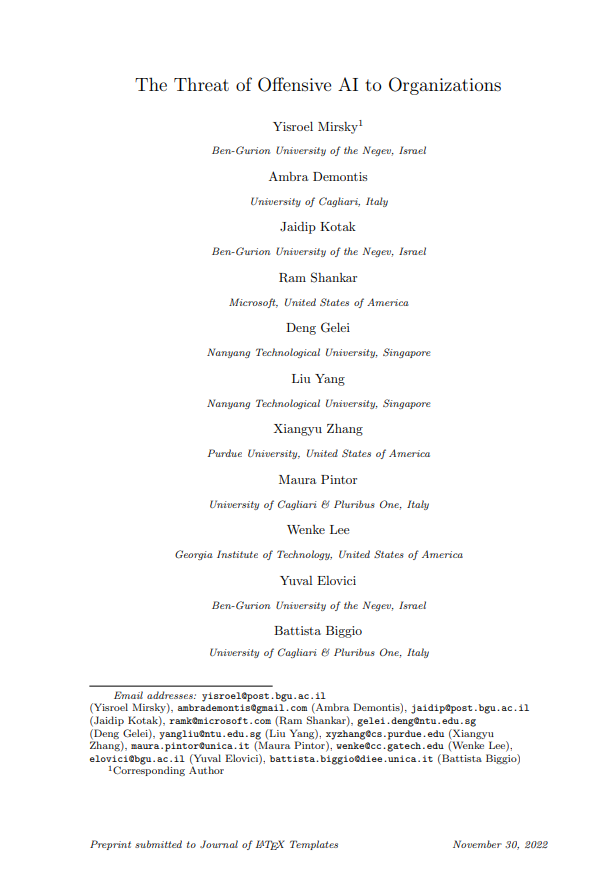 几十年来,包括政府机构、医院和金融机构在内的组织一直是网络攻击的目标[1, 2, 3]。这些网络攻击都是由有经验的黑客使用人工方法进行的。近年来,人工智能(AI)的发展蓬勃发展,这使得软件工具的创造有助于实现预测、信息检索和媒体合成等任务的自动化。在整个这一时期,学术界和工业界的成员在改善网络防御[4, 5, 6]和威胁分析[7, 8, 9]的情况下利用了人工智能。然而,人工智能是一把双刃剑,攻击者可以利用它来改善他们的恶意活动。