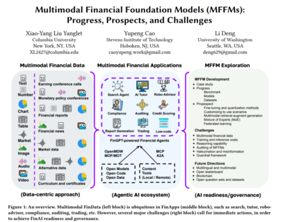 公众无法负担与亿万富翁沃伦·巴菲特共进私人午餐的费用。那么,如何以大约100美元的成本雇佣巴菲特作为我的随叫随到的财务顾问呢?在做出5000万美元的投资决定之前,如何以5000美元的费用与全球十大投资者举行一场精英头脑风暴会议呢?……不久后,当杨力(Yanglet)通过投资赚取了他的第一个100万美元时,他将会记得那晚李登博士帮助他修改多模态金融基础模型(MFFMs)研讨会的提案。 大语言模型(LLMs)已展示出在理解和生成类人文本方面的卓越能力。金融大语言模型(FinLLMs),如开源的FinGPT[26, 31, 49, 65, 67]和专有的BloombergGPT[60],在金融服务的某些领域表现出了巨大的潜力[16, 17]。不同于这种早期的以语言为中心的方法,多模态金融基础模型(MFFMs)能够处理交织的多模态金融数据,包括基础数据、市场数据、数据分析、宏观经济数据以及替代数据(如自然语言、音频、图像和视频)。多模态金融数据具有独特的特性,例如动态性、结构化与非结构化形式的并存,并且以不同的格式存在(如图表、图形、Web API、Excel电子表格、SEC文件、XBRL文件[13]和SQL数据[69])。 在实现MFFMs广泛应用的过程中,仍然面临诸多挑战,包括与可重复性、透明度、隐私和伦理相关的日益关注。首先,许多现有的LLMs作为“黑箱”运行,导致理解其操作并确保公平性成为挑战。另两个主要挑战是“模型自相残杀”(model cannibalism)和“开放清洗”(openwashing)。许多模型在训练和发布时缺乏透明度,例如Claude 3.5 Sonnet。许多所谓的“新颖”模型可能会利用现有LLMs(如GPT-4o)的标签并进行监督学习,这被称为“模型自相残杀”。因此,MFFMs在决策过程中是模糊不清的。它们带来了多种挑战,如缺乏关于训练数据的透明度、解决模型固有偏差的不足、安全性和防御问题(如后门攻击)。 近年来,出现了许多“开放清洗”行为,即将LLM的权重营销为“开放的”,但实际上受限于许可,而更理想的做法是采用OSI批准的许可(例如Apache 2.0许可证和MIT许可证)。哥伦比亚大学、牛津大学和Linux基金会的一个研究联盟提出了模型开放框架(Model Openness Framework)[57],该框架根据16个组成部分对模型进行排名,分类模型的开放性。该框架为研究人员和模型生产者提供了促进透明度和可重复性的指导。符合该框架的MFFMs将促进可重复性,并促进金融行业的广泛应用,例如开放FinLLMs[63]。对于金融机构,它为新模型在没有限制的情况下成为商业适用模型提供了明确的指导。 在本论文中,我们描述了MFFMs的进展、前景和挑战,并将在2024年与ACM国际金融人工智能会议(ICAIF)联合举办的MFFM研讨会上进行展示。本文还重点介绍了哥伦比亚大学SecureFinAI实验室对金融智能体(FinAgents)正在进行的研究。我们首先列出金融领域中的多模态金融数据和以数据为中心的方法(见图1左侧)。然后,我们描述了多模态金融应用(见图1中间部分)。我们设想,AI智能体是构建多个金融应用的有前景的解决方案。使用模型开放框架、许可(例如OpenMDW3)和智能体协议(例如模型上下文协议、Agent2Agent协议)可以构建金融智能体AI生态系统。然而,图1右侧列出了几个重大挑战,这些挑战需要立即解决,以实现金融AI的准备就绪。相关挑战包括专有数据的约束、训练和推理成本、监管复杂性、推理能力以及需要强有力的基准和防护框架来应对虚假信息和数据偏见。 我们相信,MFFMs将促进有前景的金融任务和数据分析,简化金融服务的运营。 相关工作:
