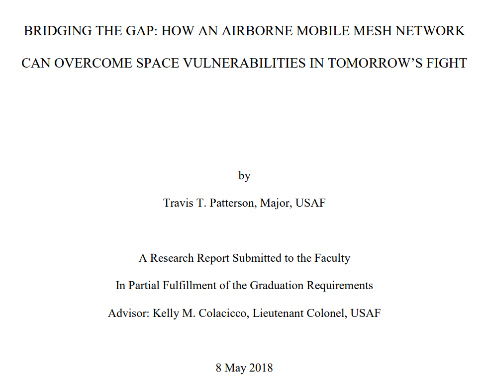 美国空军对太空能力的严重依赖,使其在不久的将来很容易受到潜在的削弱性不对称多域攻击。虽然空军领导人已经意识到保持太空领域主导地位的重要性,但他们在未来实现弹性和可生存系统的目标并非唾手可得。同行竞争者和潜在对手已经拥有多项作战和开发能力,这使美国的关键太空资产在成本交换战中处于劣势。空军的高空 ISR 平台最初托管了一个机载移动网格网络,这是降低许多此类风险的一种选择。