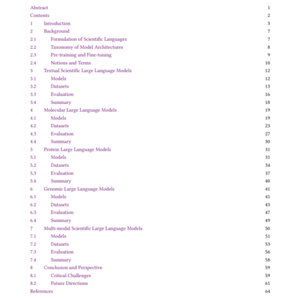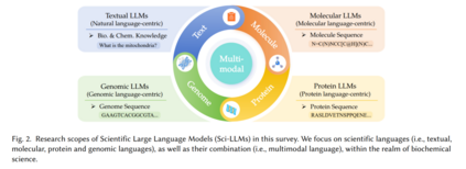在这篇综述中,我们旨在通过系统地回顾Sci-LLMs的技术进步来填补这一空白,同时密切参考通用LLMs。考虑到科学语言的广泛范围,我们将调查重点放在生物和化学语言上。具体而言,我们的审查涵盖了分子语言、蛋白质语言和基因组语言。除了这些专门的科学语言外,我们也认识到教科书、专利和研究论文中蕴含的巨大科学知识,这些文献都是用自然语言撰写的。因此,我们探索了强调科学知识的文本LLMs,更重要的是,研究了包含各种类型科学语言的多模态LLMs。