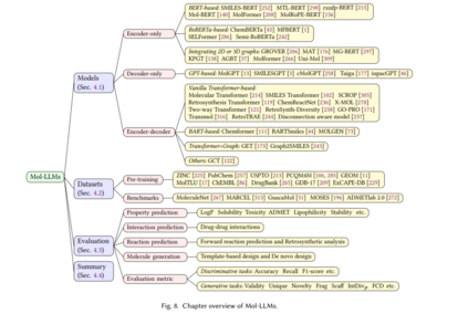 大型语言模型在加速化学分子发现方面显示出巨大潜力。在本节中,我们将回顾在分子语言(Mol-LLMs)中训练的LLMs,包括它们的模型架构、能力、使用的数据集和评估标准的洞察。本节的概览如图8所示。