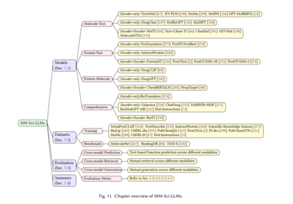 多模态大型语言模型已成为一个突出的研究领域,利用强大的LLMs作为核心来处理多模态数据。这些模型具有将不同数据类型(如文本、图像、音频和其他形式的信息)结合起来的独特能力,使得它们能够在各个领域进行全面的探索和问题解决。这些多模态模型在生物和化学科学领域,特别是蛋白质、分子和基因组研究中,展现出有希望的前景。在本节中,我们探索了这些科学领域内多模态模型的最新进展(即MM-Sci-LLMs),强调它们的能力和利用的数据集。请注意,这项综述专注于跨语言的多模态模型,涉及至少两种来自不同领域的语言,例如文本和分子。因此,我们排除了MM-Sci-LLMs中的单语言多模态方法,如蛋白质序列和结构的联合建模[228, 261, 302]。图4展示了不同语言和模态的多样形式,本节的概览如图11所示。