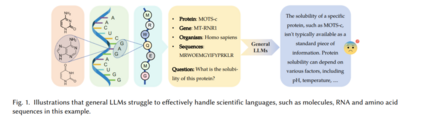除了自然语言,为了封装更专业的科学知识,开发了一系列的科学语言,如图1所示。这包括科研领域的文本表达、定义数学公式的数学语言、代表分子结构的化学语言(如SMILES),以及描述蛋白质或基因组的生物语言,详细说明生物体的复杂构成。这些科学语言带有它们独特的词汇,每个术语都有特定的含义,与自然语言完全不同。例如,英文中的字符“C”在蛋白质语言中代表氨基酸半胱氨酸[87],而在SMILES语言系统中,它代表一个碳原子[262]。此外,特定领域的专家制定语法规则来组织这些术语,使构建的句子具有精确的语义功能。例如,计算化学家创建语法规则以确保机器生成分子的准确性,使用的是SELFIES格式[128]。经过数十年的演变,科学语言已成为无价的工具,显著加速了科学发现。由于科学语言与自然语言之间可能存在的语义和语法差异,现有的通用LLMs(如ChatGPT 1或GPT-4 [190])通常无法正确处理分子和蛋白质等科学数据[5]。正如著名的奥地利哲学家路德维希·维特根斯坦所指出的,“我的语言的极限意味着我的世界的极限。”[202] 通用LLMs的世界可能仅限于自然语言。