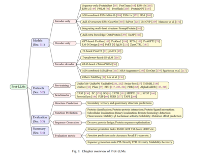 在过去的几年中,大型语言模型在蛋白质研究中变得越来越有影响力,提供了新颖的见解和能力,用于理解和操纵蛋白质。在本节中,我们提供了一个关于蛋白质的LLMs(称为Prot-LLMs)的全面回顾,包括对它们的模型架构、使用的数据集、各种能力和相应评估标准的详细讨论。本节的概览如图9所示。