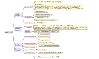 在计算生物学领域,基因组数据显示出与自然语言中观察到的基于序列的信息的相似性,使得大型语言模型能够用于分析基因组序列。在本节中,我们将回顾专为基因组语言(Gene-LLMs)量身定制的LLMs,包括对它们的模型架构、数据集和评估的洞察。本节的概览如图10所示。
