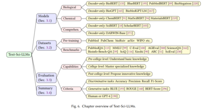 在本节中,我们旨在探索和深入研究专门使用文本语料库(即文本Sci-LLMs)训练的科学大型语言模型,特别强调它们获取化学和生物知识的能力。我们将简要回顾现有的文本Sci-LLMs,并检查它们的能力、所用数据集以及评估方法。本节的概览如图6所示。