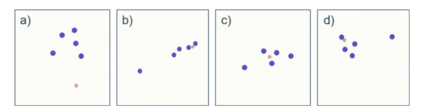 图 2:在二维模拟器上,针对五架防御无人机(蓝色)与一架目标无人机(红色)的使用案例,经过 MARL 训练的协作导航模型表现出不同的防御行为。在(a)中,无人机以凹形队形接近目标定位。在某些情况下会产生一个线性障碍( b)。捕捉目标的典型行为是包围目标,如 (c) 所示。至少有一架无人机作为蜂群的后援也是常见现象(d)。