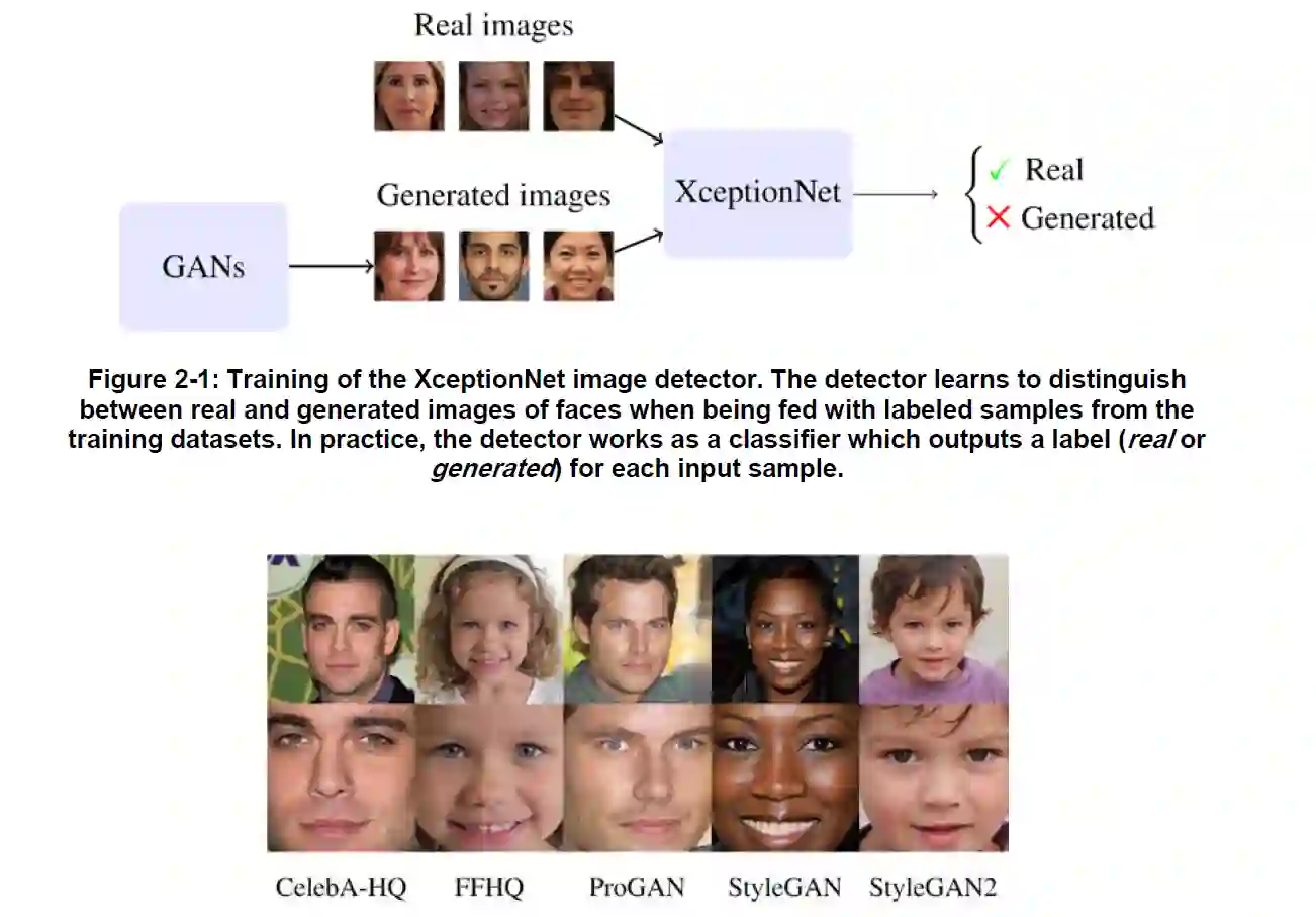 先前的工作表明,基于神经的检测器可以在生成模型为防御者所知的受控环境中可靠地检测生成的媒体[4, 5, 6, 7, 8]。然而,在野外未知来源的数据上评估检测器的工作很有限。由于检测器对后处理和模型变化的脆性是众所周知的[4, 5, 6, 9],它们是否足够可靠以用于现实世界的系统还不明显。有鉴于此,我们在Twitter数据上评估了最先进的检测器,这些数据包括个人资料图片和推文的文本。我们训练XceptionNet[10]来检测用生成对抗网络(GANs)合成的人脸图像,并微调基于变换器的语言模型RoBERTa[11]来检测用语言模型生成的文本。我们的实验与我们的原型密切相关,它可以用来进行分析和提取感兴趣的信息,而不需要终端用户有深厚的技术知识。