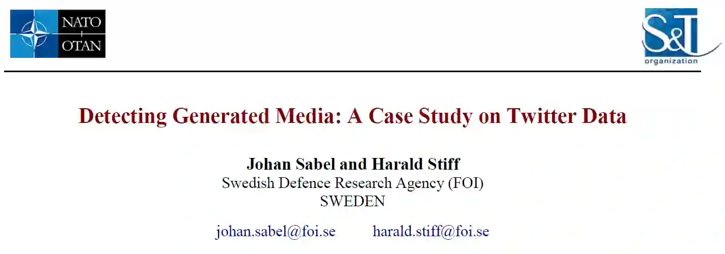 随着大规模的网络影响行动变得越来越复杂,能够核实网上信息的可信度也变得越来越困难。生成式建模的进步使得对手有可能生成大量被认为是真实的数字媒体。例如,公开的人工智能工具[1, 2]可以被利用来建立看起来像真的社交媒体资料的机器人网络,其中用户资料内容(如个人资料图片[3])和打算传播的信息(如虚假信息的推文)都是自动生成的。因此,开发能够检测生成的媒体的工具非常重要;不仅要对其采取行动,而且要研究将检测器纳入用于情报收集的系统的可能性,作为提高态势感知的一个步骤。从大量的非结构化网络数据中自动提取感兴趣的信息的能力最终可能有助于简化情报分析员和决策者的工作流程。