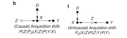 数据迁移:样本选择偏差导致的数据不匹配**。**训练和测试队列来自相同的人群,并被接受(S = 1)或拒绝(S = 0)。当选择仅依赖于图像(X→S)或目标(Y→S)时,它可以以类似于数据集移动的方式处理。当选择仅依赖于图像(X→S)或目标时(Y→S),虽然在第一种情况下 ,但目标函数可以有偏倚,可以采用相应的方法减轻数据集的偏移。当选择变量S是X和Y的共同效应时,就会出现选择偏差,一般情况下需要控制额外的变量,通过对撞机S的调节来消除X对Y的间接影响。