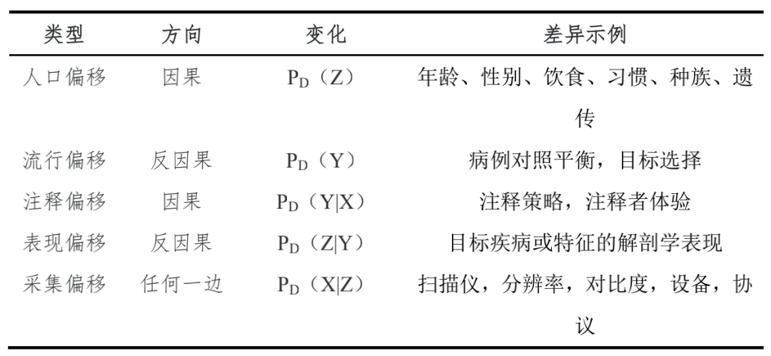**数据迁移:流行迁移。**数据集之间的差异与类别平衡有关:  。一般,由环境因素的变化引起,或是流行率的转变中训练和测试人群中不同素质引起的。如果测试类分布Pte(Y)是先验已知的(例如,根据流行病学研究),则生成模型可以在贝叶斯规则中重用估计的外观模型 Ptr(XY ) (= Pte(XY))。对于判别模型,可以通过