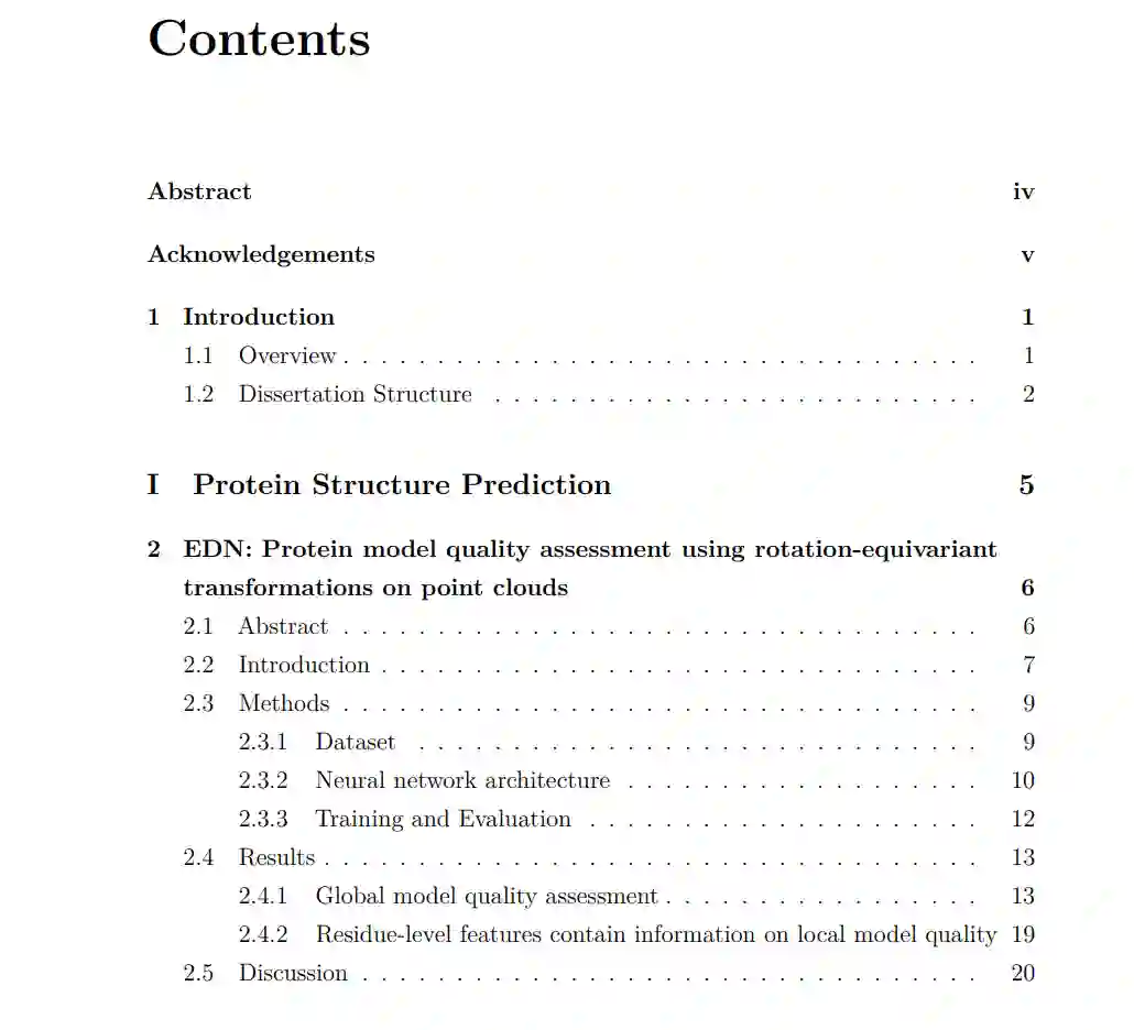 在结构生物学的更广泛背景下,实现全局一致性或全局等变性对于有效模型至关重要。模型应在对生物大分子应用平移或旋转时提供一致的预测,确保全局结构保持不变。 通过将对称性和域知识策略性地整合到我们的深度学习架构中,本论文旨在展示这些元素如何解决结构生物学中有限数据带来的挑战。我们的方法有望设计出从有限数据集中高效学习的模型,并促进理解和预测复杂生物结构的进展。