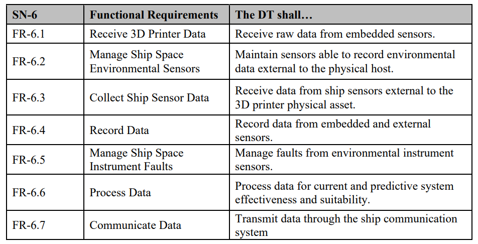 该团队最初进行了一项利益相关者分析,其中考虑了将DT用于海军系统的利益相关者。这些利益相关者的需求是基于主要赞助商(海军水面作战中心Hueneme港代码00T)和NPS顾问的指导。利用涉众的需求,进行了需求分析。基于DT系统的期望功能,分析确定了功能性/非功能性需求,以及外部接口。该团队将DT系统的功能需求缩小为7个高级需求,如表1所示。