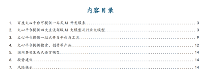 百度于2023年3月16日召开关于“文心一言”的主题发布会,“文心一言”作为国内首款正式发布的生成式语言大模型,拥有文学创作、商业文案创作、数理逻辑推算、中文理解、多模态生成等功能。文心平台依托于百度自研的产业级深度学习平台飞桨(PaddlePaddle)打造,致力于为用户提供一站式AI开发服务: AI大模型与行业大模型:文心平台提供NLP、CV、跨模态、生物计算四大主流AI研究领域的多个基础大模型,多个模型在技术层面实现突破创新,处于世界领先水平。其中,NLP领域的ERNIE3.0Zeus采用自回归网络和自编码网络,能够兼顾自然语言理解和生成功能;CV领域的VIMER-UFO2.0使用超网络结构,推理时仅需激活总参数量的1/30;ERNIE-ViLG2.0引入基于语言和图像的知识增强算法,在文本图像生成任务中的表现已经超越了OpenAI旗下的DALLE-2。文心平台与各行业企业联手打造行业大模型,目前已覆盖能源、金融、航天、制造、传媒、城市、社科、电影等8个领域。目前已有650余家知名企业宣布接入“文心一言”,涵盖企业服务、金融IT、汽车、传媒、教育、家电、金融等10余个行业。 一站式开发平台与开发工具:开发平台方面,文心面向专业知识有限的AI应用开发者提供零门槛平台EasyDL,面向专业开发者提供全功能平台BML。目前这两个平台均仅支持使用百度文心的云端算力,可采用公有云、私有化离线、软硬一体等部署方式。开发工具方面,文心提供ERNIEKit自然语言处理开发工具及PaddleFleetX全流程开发套件。此外,现阶段文心平台还向开发者免费提供大模型API。 产品与社区:百度文心通过构建产品与社区经营,对外展示生成式模型的强大性能,以此吸引爱好者投入创作,进而构筑成熟的AIGC社区,可在实践中探索AI商业化模式。目前除“文心一言”外,文心平台提供产业级搜索系统“文心百中”、艺术创意辅助平台“文心一格”,以及采用众创模式的旸谷社区。 目前百度文心生成式语言大模型在参数规模、技术创新、应用落地方面均在国内同业中处于领先水平。3月16日起,“文心一言”首批用户可通过邀请测试码接入体验,同时百度智能云将面向企业客户开放“文心一言”API调用接口,有望进一步丰富百度AI生态,赋能更多行业伙伴。