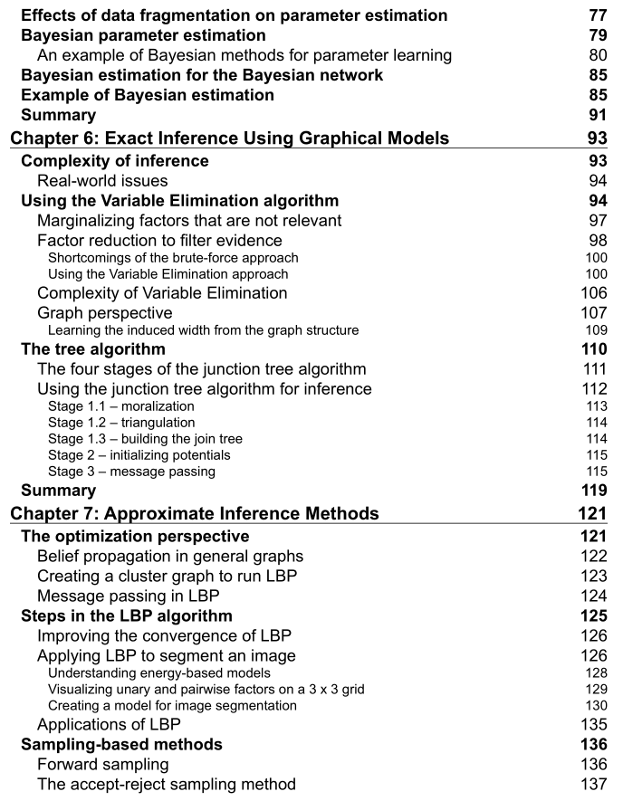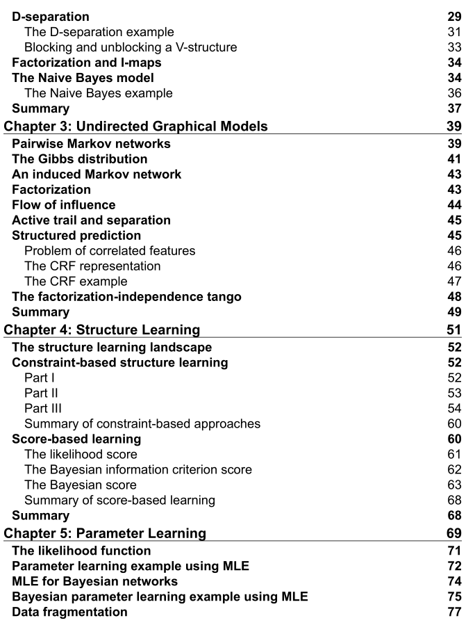 第2章:有向图形模型,提供了关于贝叶斯网络的信息,他们的属性相关的独立性,条件独立性,和D分离。本章使用代码片段加载贝叶斯网络并理解其独立性。