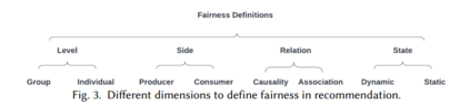长期以来,推荐系统一直被认为是“善意”的系统,它帮助用户(例如,通过帮助他们找到相关的物品),并为企业创造价值(例如,提高销售额或提高客户留存率)[141]。然而,近年来,学术界和产业界都对建议书中的公平性问题提出了相当大的关注[178]。一些研究认为,RS可能在几个方面容易受到不公平的影响,这可能会对代表性不足或弱势群体造成不利后果[109,176,180,254]。例如,在电子商务系统中,RS可能主要促进某些生产者的利润最大化[103],或者在在线就业市场中,RS可能会导致种族或性别歧视,不成比例地向某些用户群体推荐低报酬的工作[109]。因此,为了提高RS[2]中不同利益相关者的满意度,研究推荐中的公平性,建立可信负责的制度是很重要的。