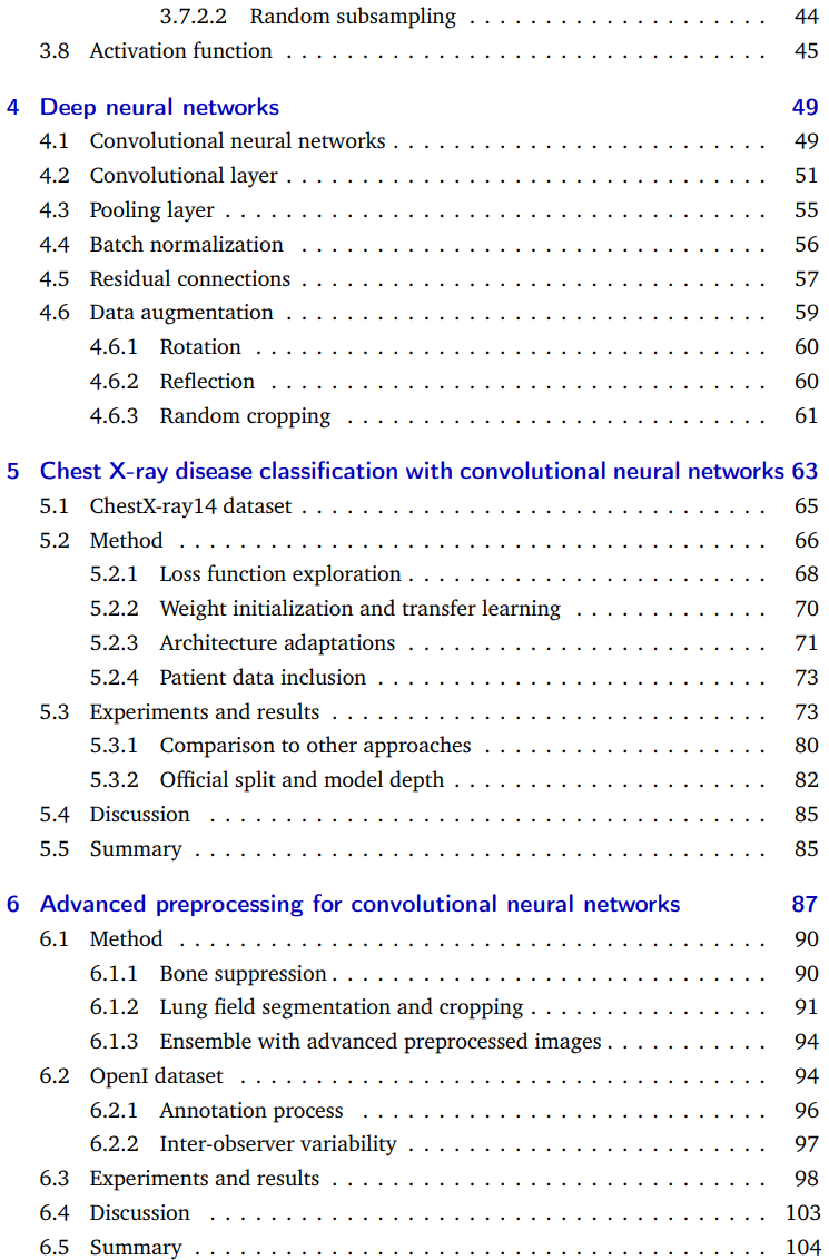 第 2 章简要介绍了医学成像及其自动化分析。此后,对深度学习的胸部 X 射线分析进行了全面回顾。作为深度学习快速发展的最重要推动力之一,我们讨论了 ChestX-ray14 [Wang et al., 2017] 和 OpenI [Demner-Fushman et al., 2016] 等开源数据集。随后讨论了由自然语言处理 (NLP) 生成的噪声注释以及高分辨率胸部 X 射线数据所带来的挑战。最后,我们在当前挑战的背景下检查了胸部 X 射线分类的临床应用。