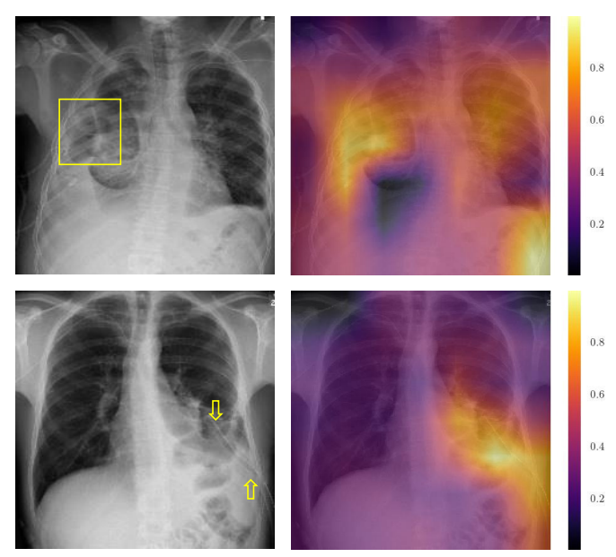 图 5.5:两个示例图像的 Grad-CAM 结果。在顶行中,气胸的位置用黄色框标记。如旁边的 Grad-CAM 图像所示,模型对预测的最高激活位于正确区域内。第二行显示了一个负例,其中负责最终预测“气胸”的最高激活位于排水管。排水管标有黄色箭头。这表明经过训练的卷积神经网络将引流检测为“气胸”的主要特征。