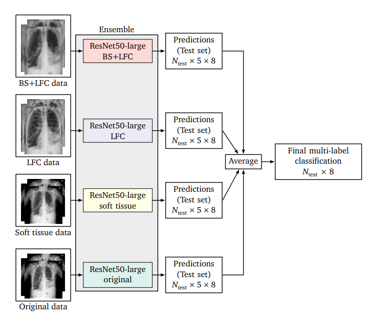 图 6.3:用于组合高级预处理图像的集成方法。四个 ResNet50-large 模型在不同的图像数据上进行了训练:原始、软组织、肺野裁剪 (LFC) 和使用 LFC 的骨抑制 (BS)。每个模型预测了测试集 Ntest 中五个裁剪图像(即中心和所有四个角)的分数,具有八个类别。此后,对所有模型的预测分数进行平均,以获得最终的多标签分类结果。