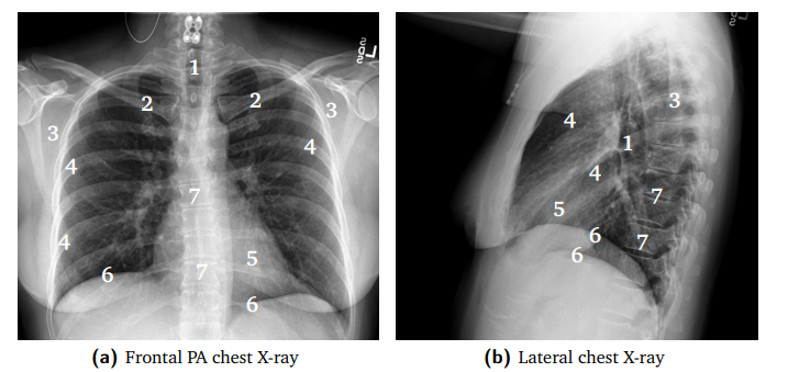 图 2.2:典型的检查类型,其中两个对应的胸部 X 射线图像取自一名患者。 (a) 显示正面 PA 胸部 X 光片和 (b) 侧面胸部 X 线片。在两张 X 光片中,可以看到解剖结构:(1) 气管、(2) 锁骨、(3) 肩胛骨、(4) 肋骨、(5) 心脏、(6) 横膈膜和 (7) 构成脊柱的椎骨.示例图像取自 OpenI 数据集 [Demner-Fushman et al., 2016]。